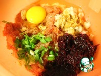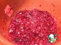 Зеленый лук мелко нарезать, свеклу натереть на мелкой терке. Все это добавить к фаршу. |