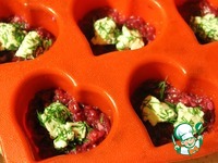 Силиконовые формочки смазать слегка 1 ч. л. растительного масла. На дно каждой формочки выложить по 1 ч. л. фарша. Сверху положить по два кусочка сыра с укропом. |
