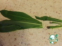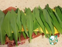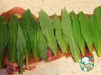 Мясо достать из маринада, разложить на рабочей поверхности, сверху выложить листочки черемши. |