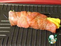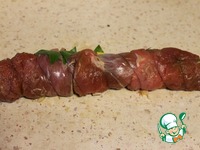 Свернуть рулетом по длинной стороне и перевязать ниткой или шпагатом. |
