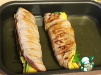 Для удобства, я разрезала рулет пополам. Обжарить каждый рулетик на гриле со всех сторон, до золотистой корочки. |