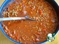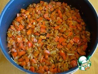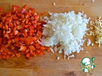 5. Потушить лук в растительном масле до прозрачности, добавить перец и готовить, помешивая, еще несколько минут, затем добавить чеснок, чили, паприку и кумин, размешать и прогреть еще 2 минуты. |