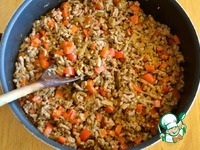 6. Выложить в сковороду к овощам говяжий фарш. Немного усилить огонь. Готовить примерно пять минут, постоянно помешивая и разминая большие комочки фарша, если они появятся. |
