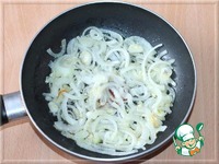 На чистой сковороде, на разогретом масле обжариваем до вот такой прозрачности (не пережаривать) порезанный полукольцами репчатый лук и порубленный мелко чеснок. |
