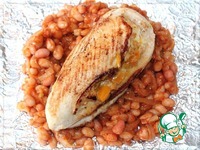 Разогреваем духовку до 180 С. Отрезаем 4 листа фольги и кладем в центр каждого листа 1/4 часть смеси с фасолью. На фасоль кладем фаршированную грудку и посыпаем курицу острой паприкой. |