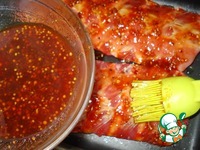 Через 30 минут с начала приготовления достанем ребрышки, приоткроем фольгу и смажем ребрышки еще глазурью, прикроем фольгой и еще на 30 минут в духовку. |