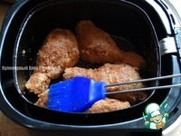 Мультипечь разогреть до 200 градусов (можно заменить д/ш); Запанировать голени: сухари-яйцо-сухари-я йцо-сухари; Выложить на решетку мультипечи и обмазать с обоих сторон маслом; |
