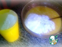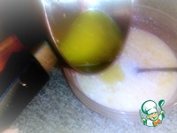Добавить в смесь (к яйцам, сахару и соды) 0,5 ст. молока и растопленного сливочного масла, тщательно перемешать. |