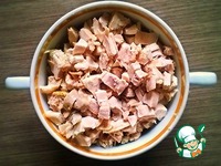 Курицу сварить и порубить. Можно использовать мясо запеченной или копченой птицы. |