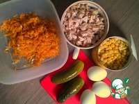 Сварить и измельчить яйца. Нарезать огурцы. Смешать с курицей, морковью и луком, кукурузой. |