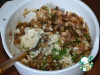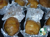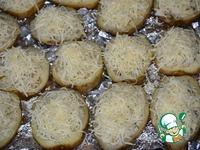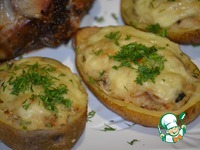 Теперь начиняем половинки картофеля получившимся фаршем, сверху посыпаем натертым сыром и оставляем пока. |