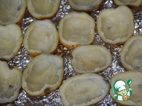 Запеченный картофель режем на половинки и вынимаем серединку, получить должны вот такие лодочки. |