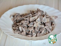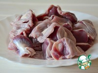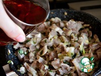 К луку добавить подготовленные желудки. Влить немного бульона, буквально ложки 3 (в котором варились желудки), вскипятить |