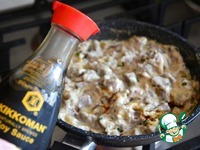 Добавить соевый соус Киккоман. Все хорошо размешать, выключить огонь и накрыть крышкой |