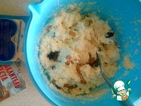 Займемся начинкой. В чашку высыпаем творог, разбиваем яйца, всыпаем манку, муку, добавляем сгущенное молоко, разрыхлитель и изюм. |