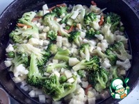 Первым делом я поставила бланшировать овощи. Залила их водой из чайника, теплой, проварила минуты наверно 3-5. И ставим разогреваться духовку до 180 градусов. |