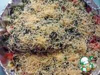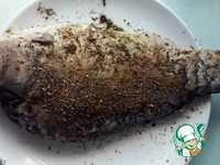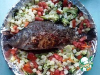 Застилаем форму фольгой. В центр кладем карпа, а вокруг выкладываем наши овощи. Края фольги загибаем по форме, если остались. |