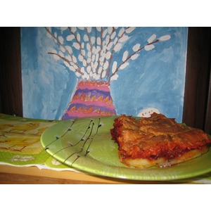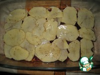 Картофель распределить сверху, стараясь, чтобы он равномерно и полностью закрыл свекольный слой. Поставить в духовку и запекать 30-40 минут при температуре 200°C. |
