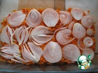 Сверху положить слой морковки, натертой на терку, и лук, нарезанный кольцами. |