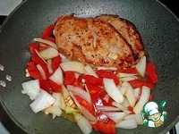 В глубокой сковороде или сотейнике разогреть 2ст. л. масла, поджарить куриное филе на среднем огне до румяной корочки с одной стороны. Перевернуть, добавить лук, чеснок и красный перец. |
