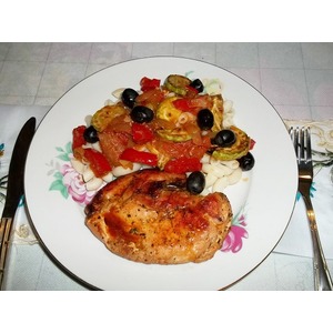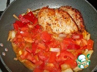 Описание: Предлагаю попробовать простое, но вкусное и яркое блюдо. Сочное куриное филе, томатный овощной соус, макаронные изделия - быстрый и довольно красивый ужин.
