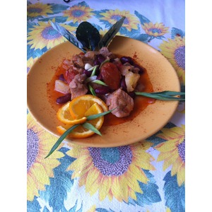 Подрумяньте мясо на оливковом масле. Посолите поперчите. Добавьте измельченный лук и чеснок, тмин и красный перец. Перемешайте. Переложите мясо в кострюлю. Добавьте помидоры (я брала помидоры черри в собственном соку, с кожицей, домашнего производства) красную фасоль, которую предварительно следует промыть. Добавить перец чили, предварительно очищенный от семян, ( можно 1/4, если будет есть ребенок) и воду. Я добавила 2 картошины, но в оригинальном рецепте ее нет, так что по желанию, можно не добавлять. Накрыть крышкой и тушить до готовности мяса.