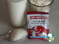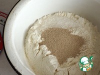В муку высыпать дрожжи. Перемешать. Дрожжи Саф-момент быстродействующие и их нужно обязательно смешивать только с мукой, не нужно в жидкости их разводить, хотя многие так делают. |