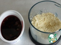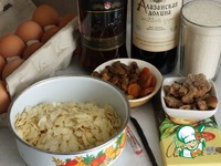 Изюм промыть, обсушить и залить ромом и красным вином, оставить настояться, пока готовим тесто (я еще добавила несколько штучек кураги). Миндаль измельчить. |