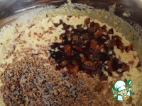 Добавить изюм с алкоголем, и натертый шоколад. Я использовала готовую шоколадную стружку (25 гр.) и натертый шоколад (25 гр.), поэтому на фото он разного цвета. Все перемешать. |