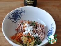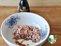 Для приготовления берём свиной фарш. Хотя начинка может быть из баранины, говядины, птицы, рыбы, морепродуктов. Добавляем к фаршу соевый соус ТМ Kikkoman. |