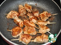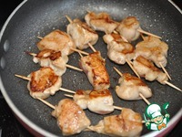 Берём зубочистки. Насаживаем по два кусочка 1 на 1 см или по одному кусочку 1 на 2 см курятины на каждую зубочистку. |