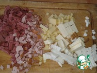 В это время нарезать кубиками колбасу и сыры. У меня была копченая и вареная колбаса и 3 вида сыра: копченый, плавленный и полутвердый |