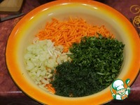 Морковь нашинковать тонкой соломкой или натереть на крупной терке, сельдерей нарезать тонкими ломтиками (если корневой поступить также, как с морковью). Чеснок очистить. Зелень мелко нарезать. |