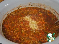 Через 30 минут кипения добавить подготовленные овощи, кроме чеснока и зелени, а также растительное масло, сахар, и соль. Довести до кипения и варить на маленьком огне 15 минут. |
