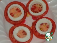 Отварное яйцо порезать на кружочки. Аккуратно убрать желток. Кольца из белка кладем на помидоры. |