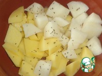 Картофель очистить и порезать кубиками. Посолить по вкусу и смешать с базиликом. |