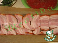 Форму длинную (объем 1,5 литра) застелить пергаментом. Бекон порезать тонкими полосками и выложить в форму, закрывая бока и дно (чуть-чуть внахлест). |