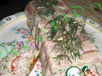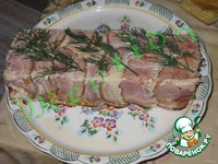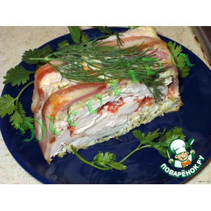 Описание: Нежный куриный террин с сыром, помидорами, специями и травками, в обрамлении бекончика.