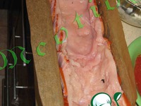 Закрыть дно и стенки пластинками из 3 отбитых кусочков филе. |