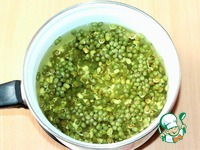 Пророщенную фасоль промыла и залила на 1 минуту кипятком. На фото видно, как шкурка (шелуха) поднялась вверх. Её надо удалить при помощи шумовки. Воду слить, фасоль охладить. |