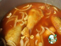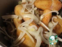 Сверху положить обжаренные голени, лук нарезанный полукольцами и чеснок нарезанный пластинками. |