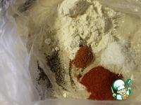 Берем обычный прозрачный полиэтиленовый пакет. Насыпаем в него муку, перец чили, черный перец, соль и паприку. Перемешать. |