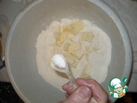 Сливочное масло рубим ножом на кусочки в 4,5 стаканах муки. |