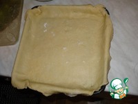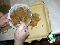 Затем, я выкладываю свою начинку на противень с тестом. |