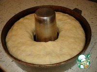 Сворачиваем плотный рулет, концы соединяем в кольцо и выкладываем в смазанную маслом форму. Накрываем плёнкой и оставляем для подъёма. |