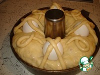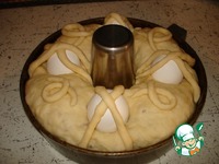 Теперь вдавливаем в него сырые (не забудьте вымыть и вытереть насухо) яйца. Из отложенного кусочка теста делаем жгутики и закрепляем яйца на пироге крестообразно. |