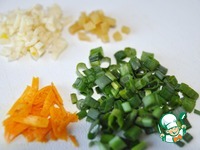 Пока маринуется курица, подготовим остальные продукты. Мелко нарезаем имбирь, чеснок и цедру. Зелёный лук режем тонкими колечками. |