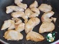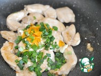 Кладём назад курицу на сковородку. Добавляем нарезанные зелёный лук, чеснок и цедру. |