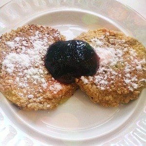 Готовые оладья я посыпала сахарной пудрой и добавила черничный джем. Получилось очень сытно, вкусно и при этом малокалорийно.