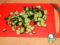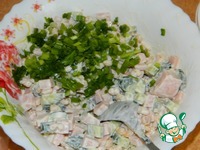 Соединить фасоль с огурцами и ветчиной. Добавить измельченный чеснок, зелень лука и заправить салат майонезом. Немного охладить и дать настояться. |